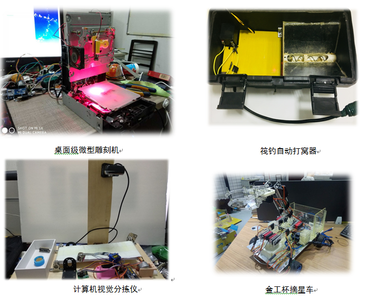 本次展览,微凡创客空间充分向我校师生展示了中心的学生作品:桌面级微型雕刻机、计算机视觉分拣仪和筏钓自动打窝器为创客空间优秀学生彭文正和张永亮合力创作,作品含有很高的科技水平和创造能力,具有较高的实用价值;所展示的3件金工杯“星球大战”小车也充分表现出学生的技能水平和动手创作能力;我校连续5届工程训练大赛一等奖作品和机械创新大赛中获得优异成绩的做品也在本次展览中展出。这些作品向师生们既展示出我校实践强校的教学成果,也展现了我校对国家高校赛事的重视以及我校学生很强的工业制造和创新能力。